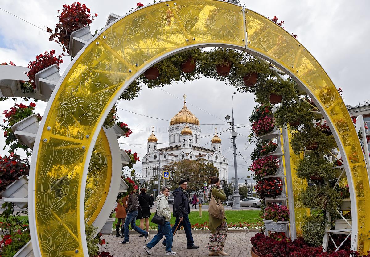 Виды Москвы. Праздничное убранство ко Дню города на Гоголевском бульваре. Храм Христа Спасителя.