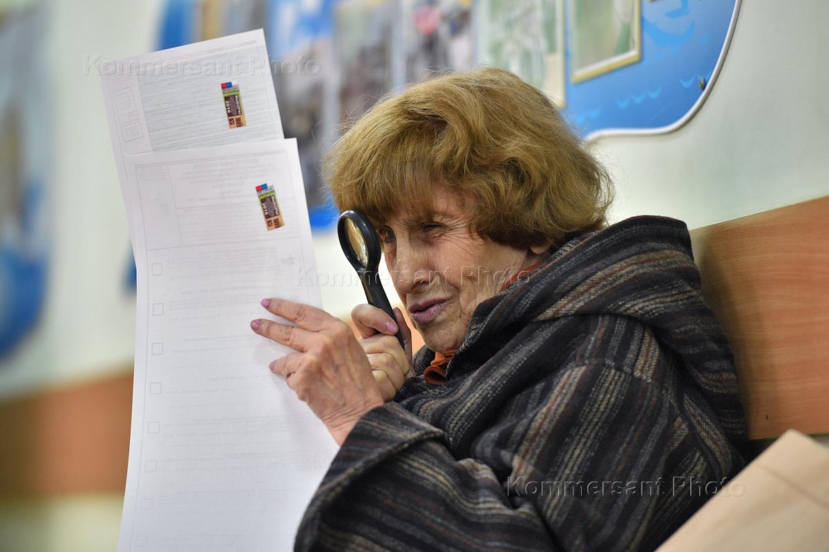Выборы депутатов Государственной думы России VII созыва. Голосование. Жанровая фотография. Пожилая…