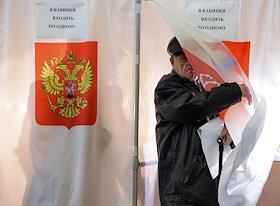 Выборы депутатов Государственной думы VII созыва. Голосование. Избиратель в избирательной кабинке на…