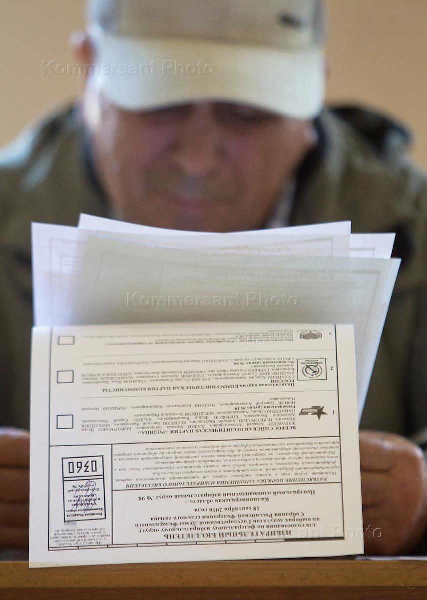 Выборы депутатов Государственной думы России. Избиратель держит в руках бюллетень для голосования.