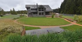 Готовый дом в загородном комплексе Honka Club. Тыльная сторона дома с клумбой и газоном.
