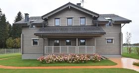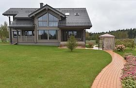 Готовый дом в загородном комплексе Honka Club. Фасадный вид дома с обширной лужайкой.