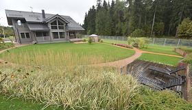 Готовый дом в загородном комплексе Honka Club. Тыльная сторона дома с клумбой и газоном.