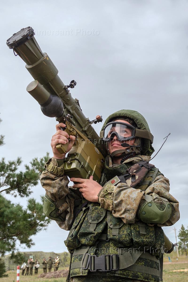 Батальонные тактические учения с боевой стрельбой на полигоне Погоново. Солдат держит переносной…