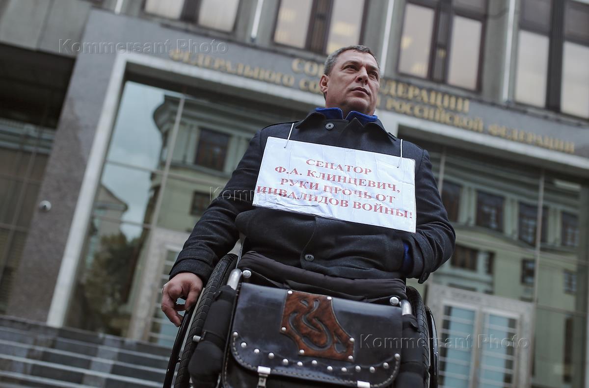 Политика Акция протеста члена Общероссийской общественной организации инвалидов войны в Афганистане и военной травмы "Инвалиды войны" Алексея Ермохина, направленная против действий политика Франца Клинцевича, у здания Совета Федерации.