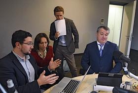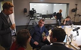 Генеральный директор ЗАО "Газпромнефть-Аэро" Владимир Егоров (в центре) во время интервью в студии…