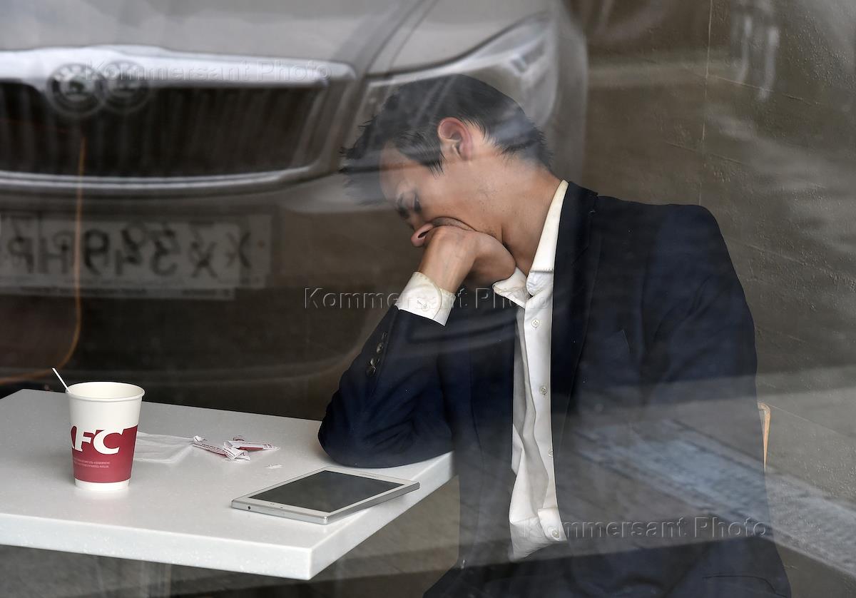 Жанровая фотография. Мужчина (бомж) спит в вагоне метро.