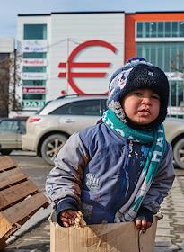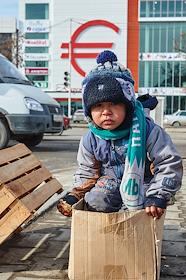 Бездомный ребенок около центрального рынка на фоне здания со знаком евро на фасаде.