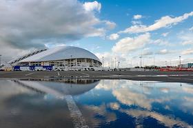 Виды Сочи. Здание стадиона в Олимпийской деревне, отражающееся в луже, после сильного ливня.