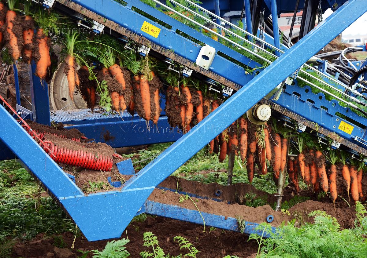 Жанровая фотография. Уборка урожая при помощи морковоуборочного комбайна в сельхозпредприятии…
