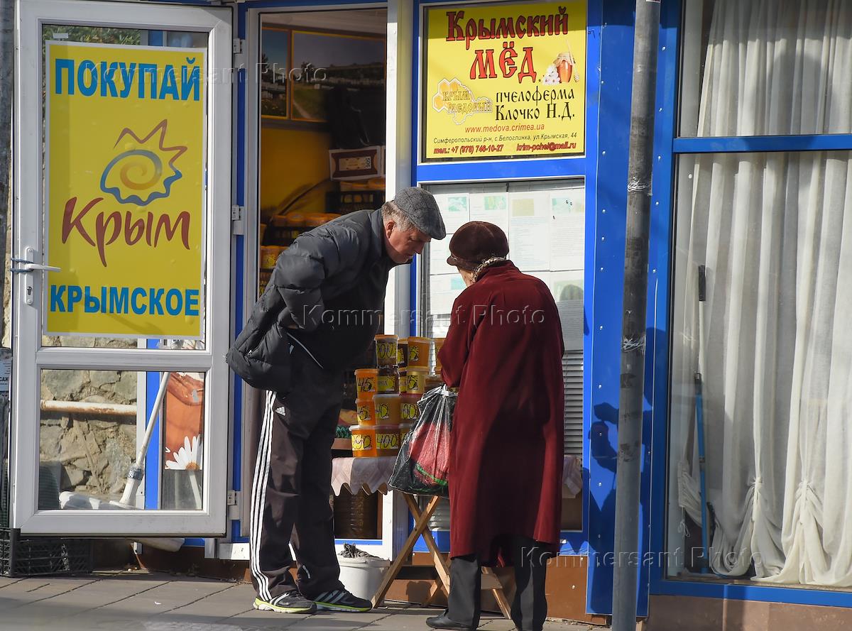 Жанровая фотография. Пенсионерка покупает мед в торговой палатке.