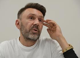 Лидер группы "Ленинград" Сергей Шнуров перед началом встречи в Академии журналистики Коммерсантъ.