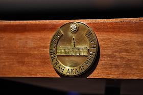 Общее собрание членов Российской академии наук (РАН) состоялось в Большом зале РАН. Эмблема РАН на…