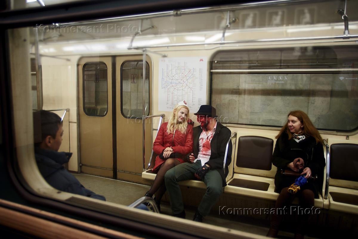 Жанровая фотография. Празднование Хэллоуинн. Молодые люди в гриме зомби возвращаются в метро после …