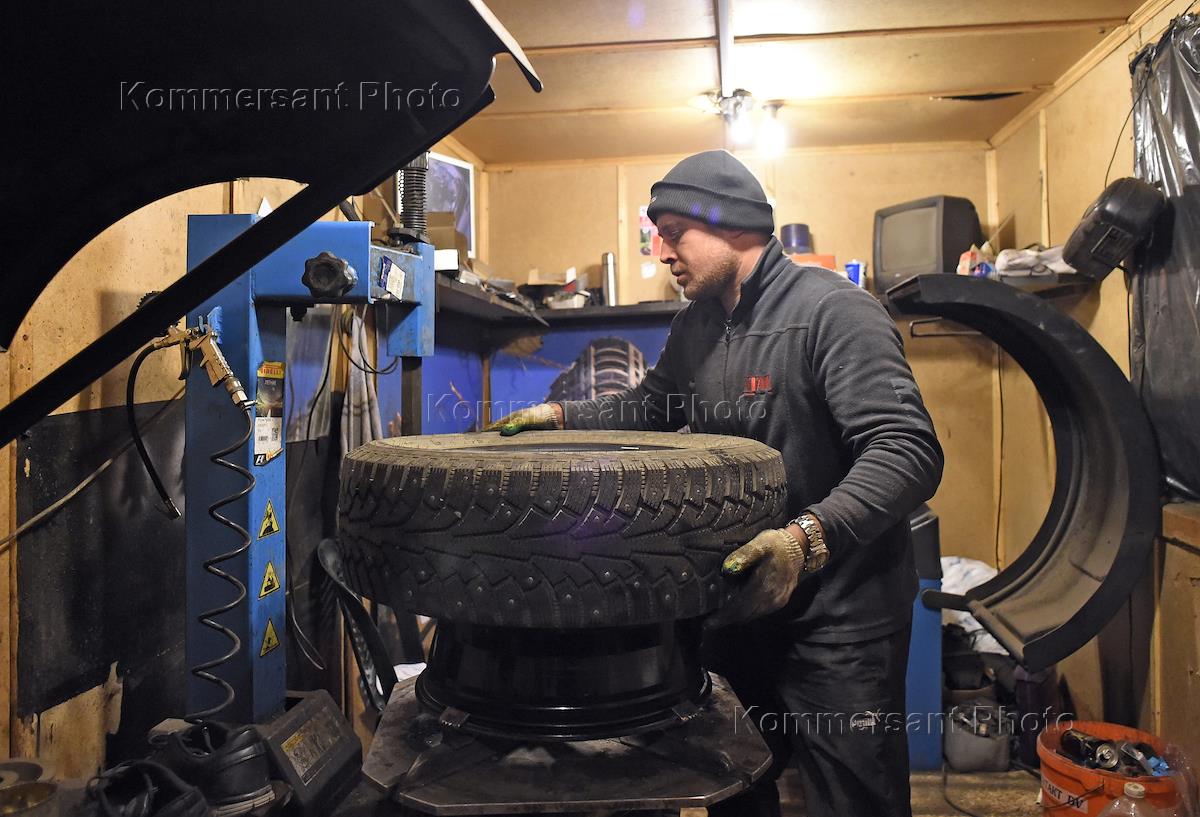 Жанровая фотография. Работа шиномонтажа. Замена летней резины на зимнюю.