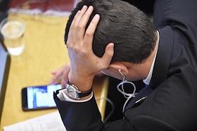 Пленарное заседание Государственной думы (ГД) России. Жанровая фотография. Депутат ГД России слушает…