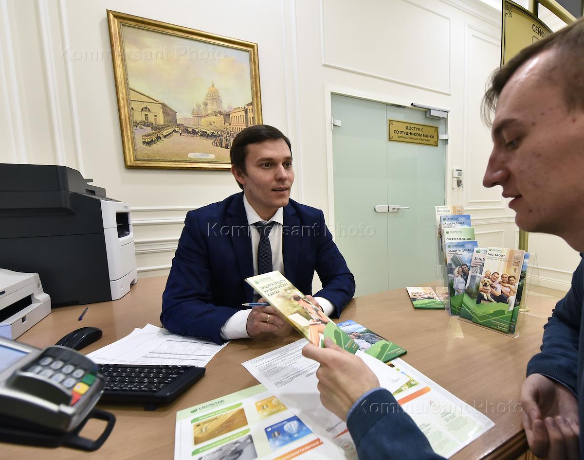 Жанровая фотография. Руководитель отделения банка "Сбербанк" во время приема клиента в своем рабочем…