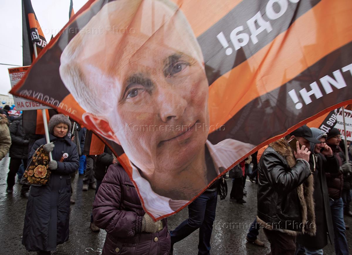 День народного единства. Участница праздничного шествия по Тверской улице с флагом России в руке.