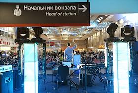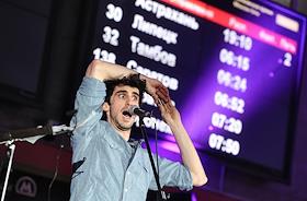 Ежегодная культурно-образовательная акция "Ночь искусств". Спектакль "Сентенции Пантелея Карманова" по пьесе Ивана Вырыпаева в постановке режиссера Зары Антонян был показан в зале ожидания Павелецкого вокзала. Актер Стивен Окснер во время спектакля.