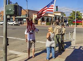 Жанровая фотография. Бригада по развешиванию флагов с флагами США на светофоре в Мишен-Вьехо штата…