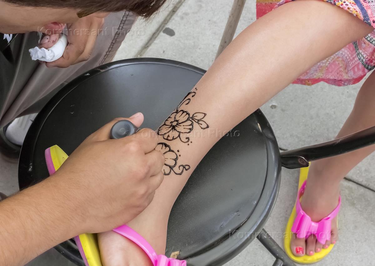 Жанровая фотография. Венис-бич в Лос-Анджелисе. Нанесение татуировки хной на ногу девочке.