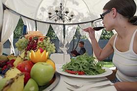 Летняя площадка ресторана "Табак". Девушка сидит за столиком с фруктами.