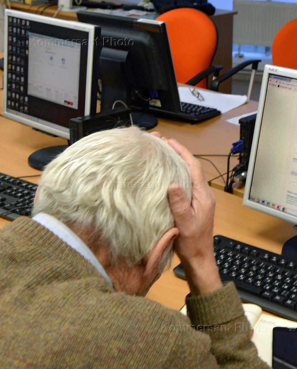 Реализация программы обучения компьютерной грамотности людей старшего поколения. На мониторе -…
