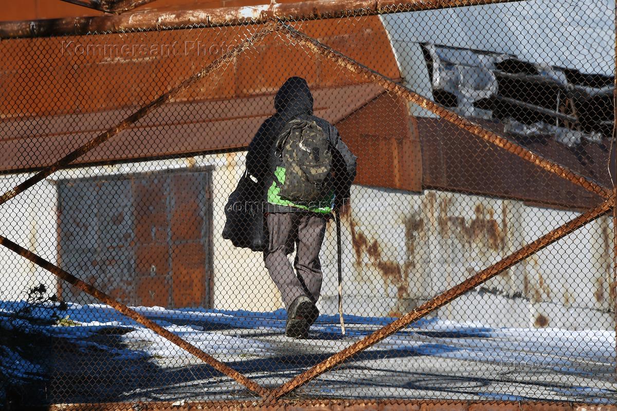 Жанровая фотография. Мужчина с рюкзаком за ржавым забором из сетки-рабицы.
