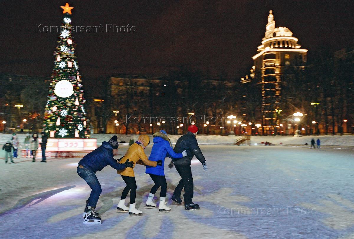 Виды вечерней Москвы. Отдыхающие на катке на Патриарших прудах.