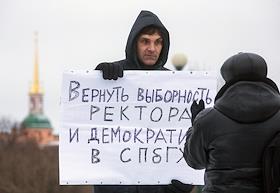 Преподаватель Санкт-Петербургского Государственного университета с плакатом "Вернуть выборность…