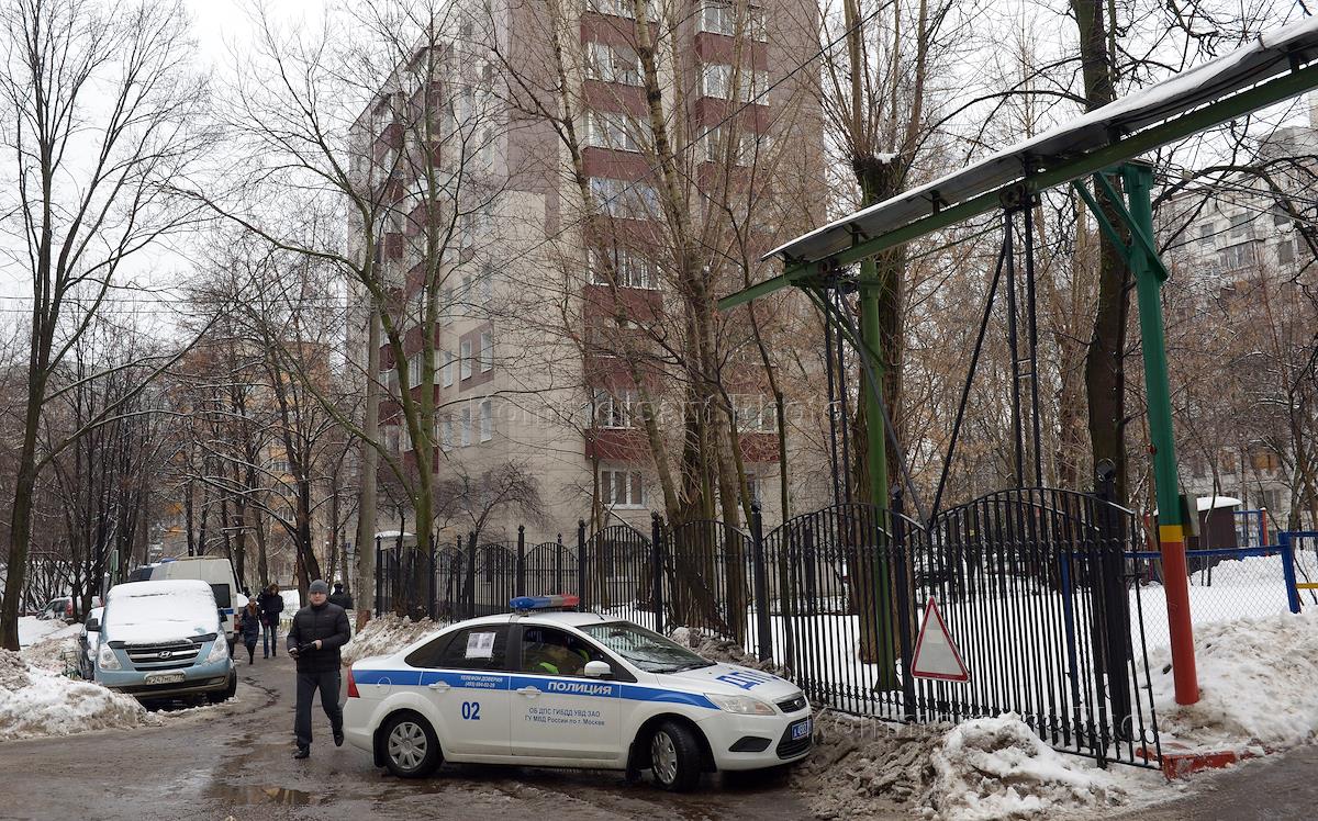 Происшествия и конфликты Ситуация на Ельнинской улице на западе Москвы, где мужчина захватил в заложники женщину и открыл стрельбу по полицейским. Сотрудник правоохранительных органов на месте происшествия. При задержании злоумышленника ранены трое полицейских.