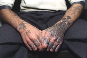 Колония строго режима К 231 для туберкулезных больных. Человек с татуировками (наколками) на руках.