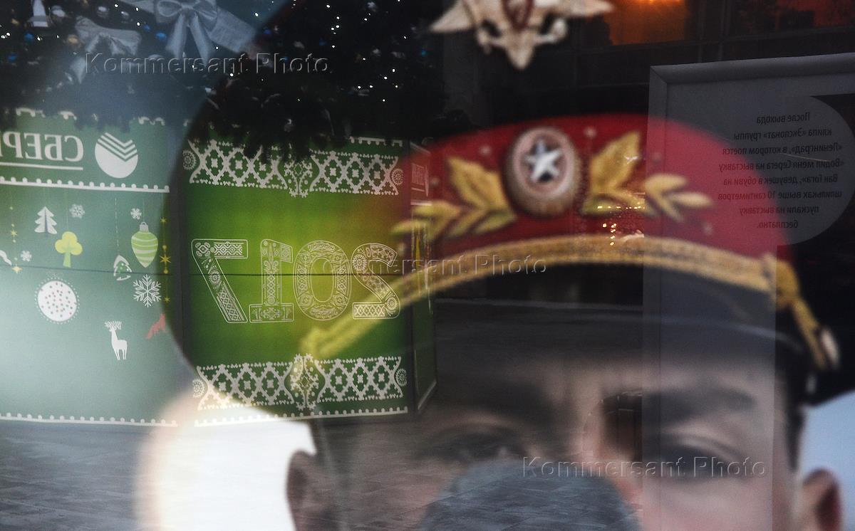 Жанровая фотография. Военнослужащий на фоне уличного новогоднего украшения.