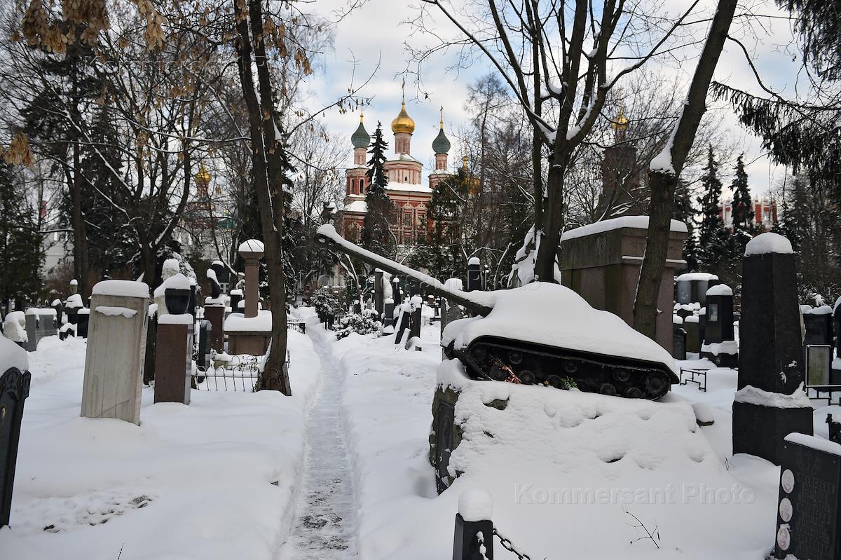 Жанровая фотография. Могильный памятник на Новодевичьем кладбище в снегу.