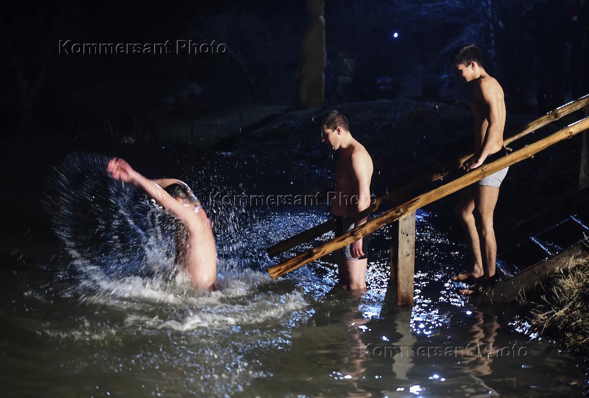 Крещенские купания в пруду во время праздника Крещения Господня.