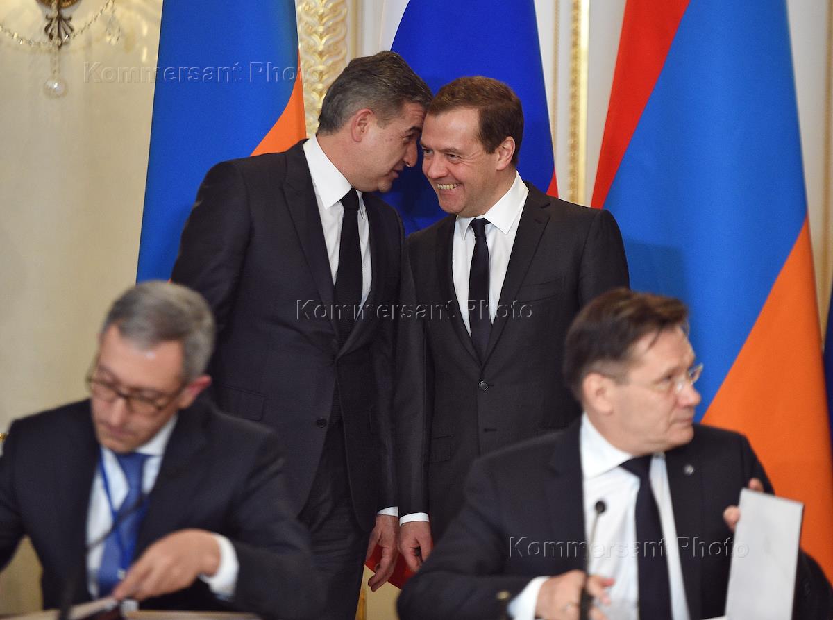 Председатель правительства России Дмитрий Медведев (в центре) и премьер-министр Армении Карен…