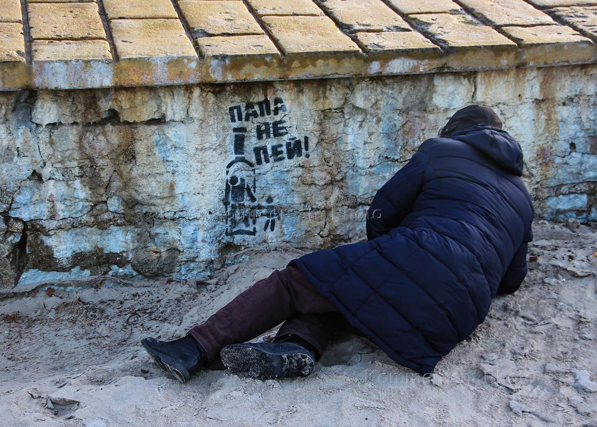 Жанровая фотография. Лежащий на снегу мужчина на фоне стены с граффити "Папа, не пей!"