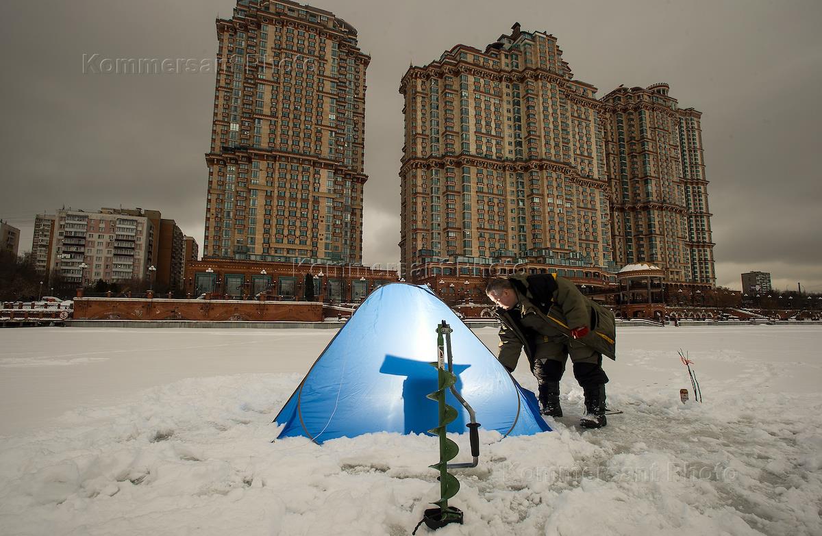 Жанровая фотография. Зимняя рыбалка в Москве. Жилой комплекс "Алые паруса".