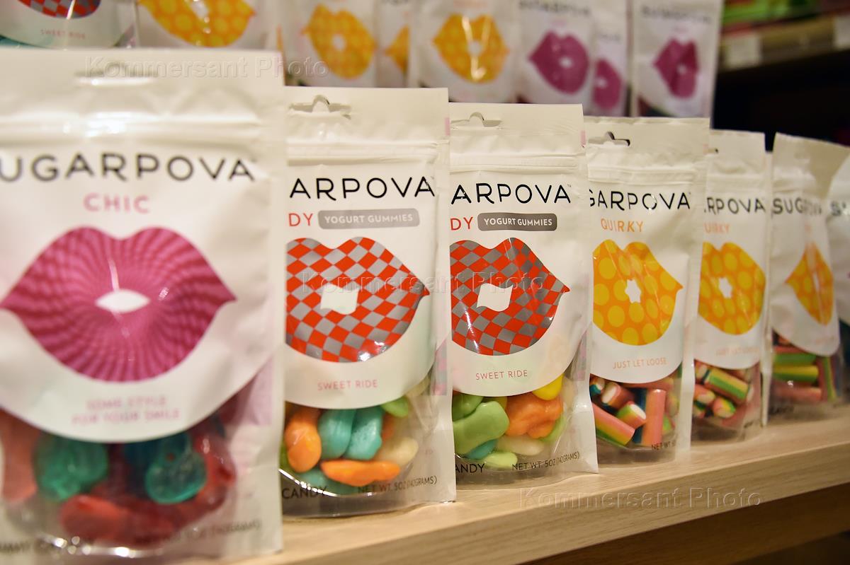 Светская жизнь Российская теннисистка Мария Шарапова на презентации своей новой линейки шоколада под брендом Sugarpova в супермаркете "Азбука Вкуса" в торговом центре Lotte Plaza. Премиальная линия оригинальных конфет, созданная теннисисткой Марией Шараповой, Sugarpova