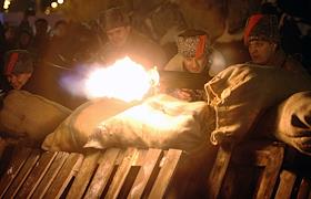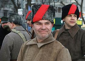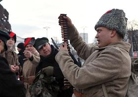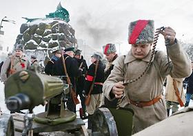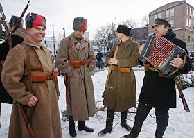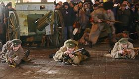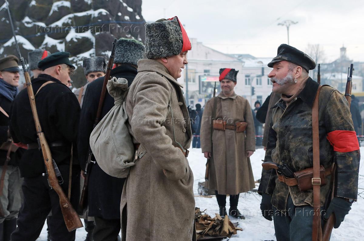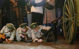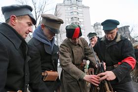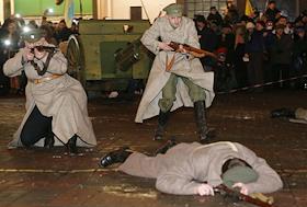 Общество Военно- историческая реконструкция боя войск УНР (Украинская Народная Республика) против большевиков за завод "Арсенал" на Арсенальной площади в центре Киева.