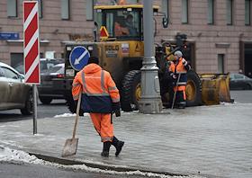 Жанровая фотография. Сотрудники коммунальных служб города во время уборки снега на улице в центре…