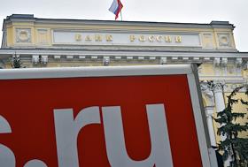 Жанровая фотография. Указатель с фрагментом надписи ".ru" на фоне здания Центрального Банка России.