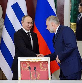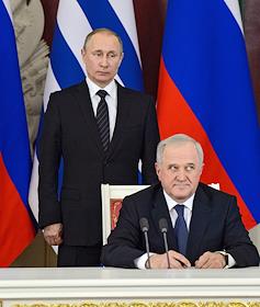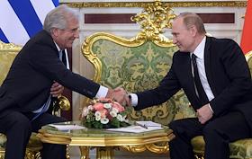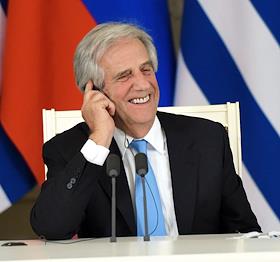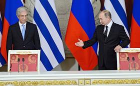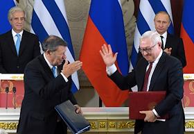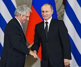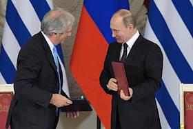 Президент России Владимир Путин (справа) и президент Восточной Республики Уругвай Табаре Васкес…