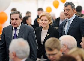 Экономика и бизнес Заместитель председателя правительства РФ Ольга Голодец, полномочный представитель президента РФ в Сибирском федеральном округе Сергей Меняйло и губернатор Новосибирской области Владимир Городецкий на церемонии открытия клинического госпиталя "Авиценна" группы компаний "Мать и дитя".
