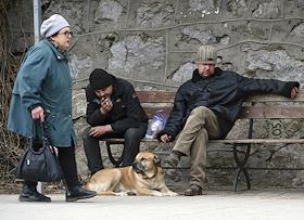 Жанровая фотография. Пьяные мужчины с собакой сидят на лавочке.