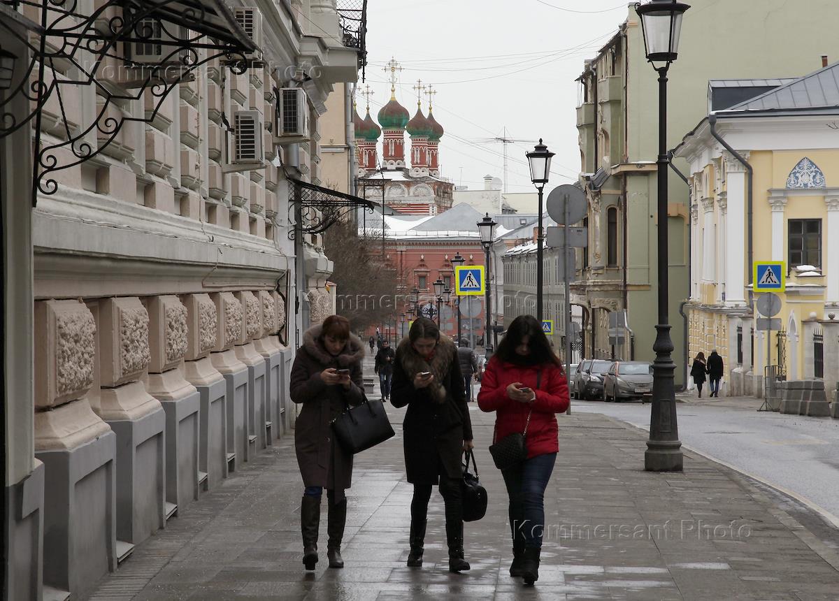 Виды Москвы. Девушки с мобильными телефонами идут по улице.