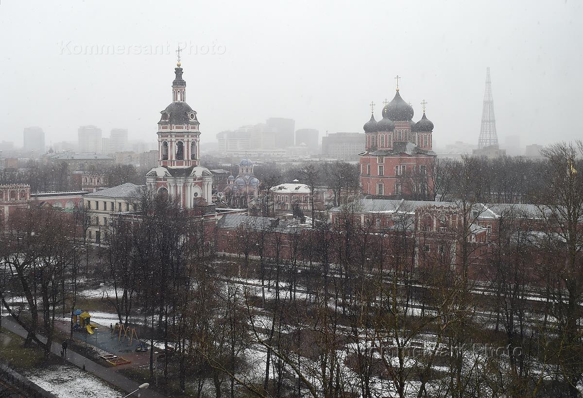 Виды Москвы. Большой собор и надвратная колокольня Донского монастыря и Шуховская телебашня.