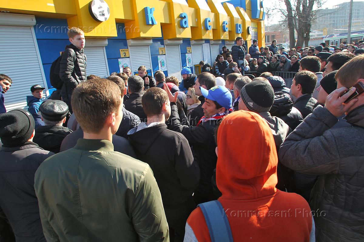 Болельщики футбольной команды "Ростов" (Ростов-на-Дону), в очереди за билетами в кассах стадиона…