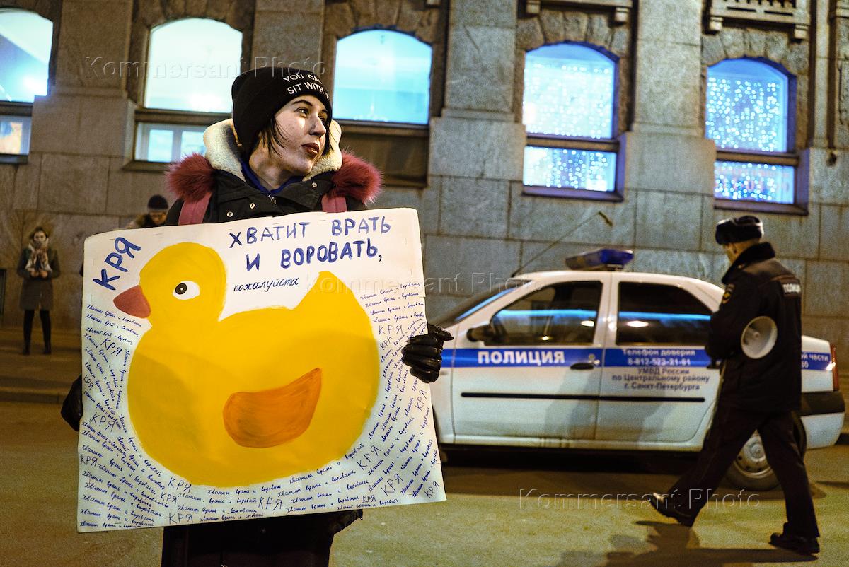 Акция протеста "Народный сход" за отставку Дмитрия Медведева. Участница с плакатом "Хватит врать и…