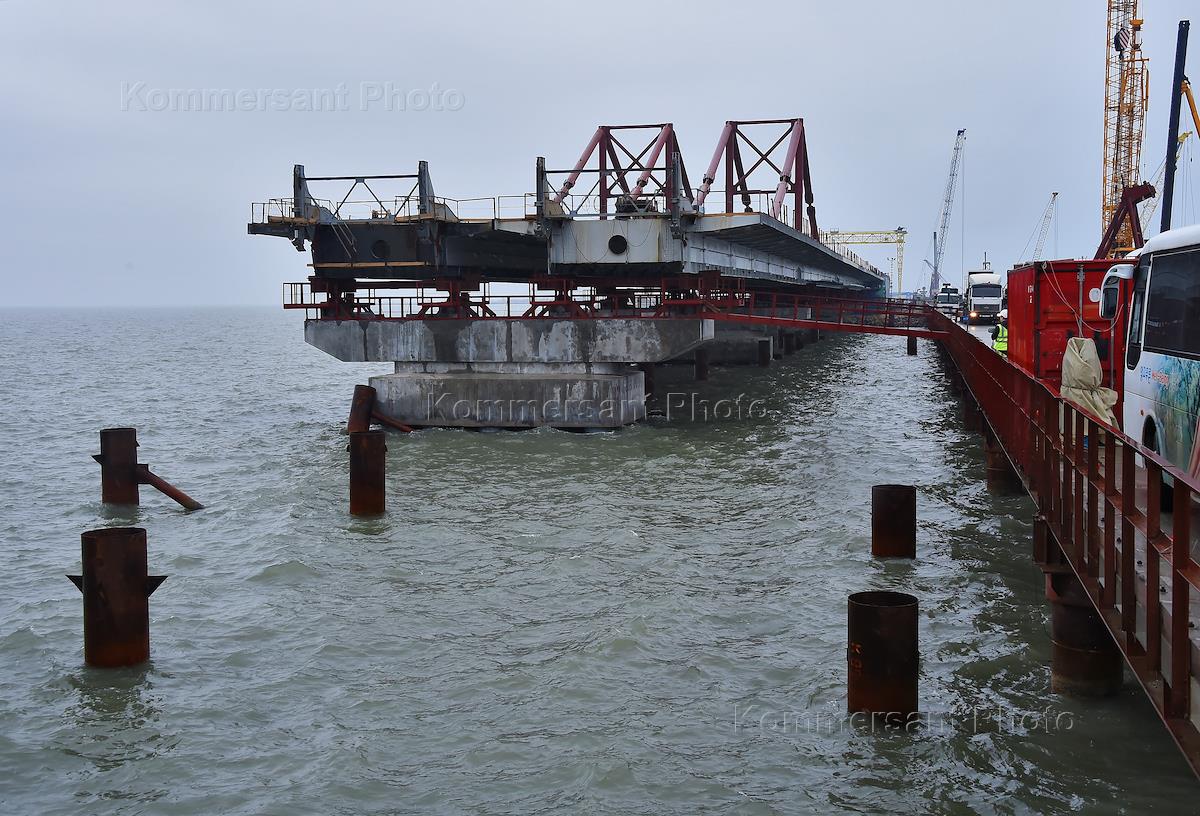 Строительство Крымского моста в Керченском проливе, который свяжет Крым с материковой Россией.